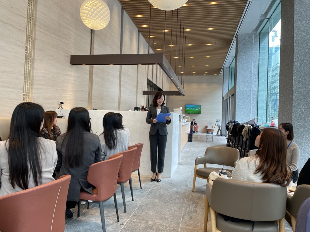 4回目の開催となる今回は、18名が参加し、元ビジネスマナー講師であるクリアル社の堤氏による「女性首相の印象管理術」と題した印象操作に関する講話を行っていただいたほか、それぞれの業務内容について情報交換をしました。